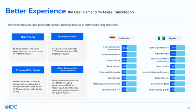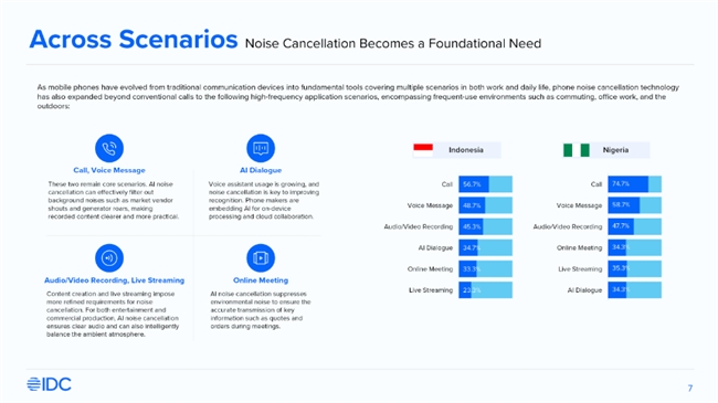 IDC調研顯示,在印度尼西亞和尼日利亞,分別有65.6%和69.3%的用戶對手機降噪功能存在強烈需求,約三分之一用戶在選購手機時將降噪能力視為重要考量因素。同時,由于當地藍牙耳機普及率較低,手機端內置降噪能力成為提升通話體驗的關鍵解決方案。