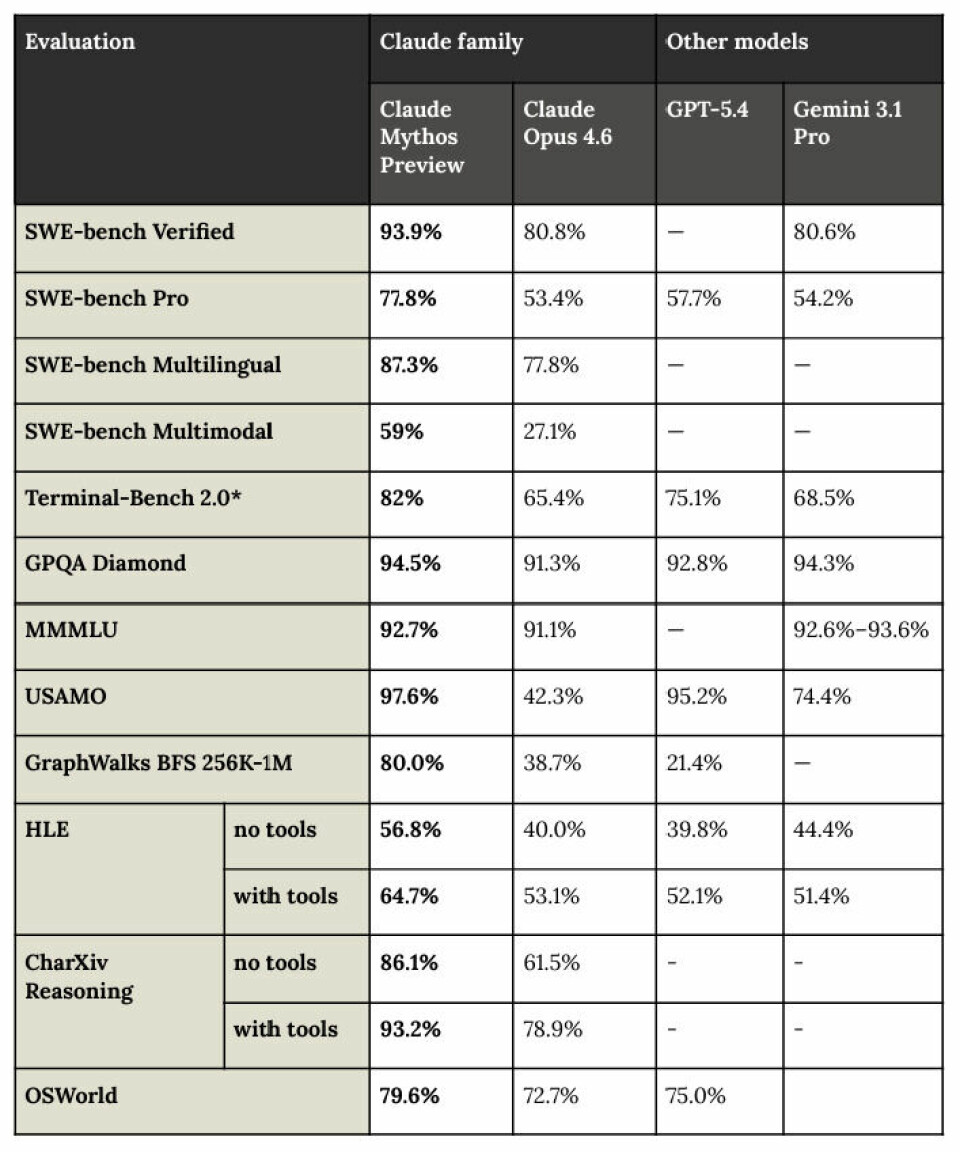 由此我們推測,Mythos 很可能采用了某項(xiàng)突破性技術(shù),實(shí)現(xiàn)了跨越式升級(jí)。這一點(diǎn)在 SWE-bench 代碼助手基準(zhǔn)測試、GraphWalks BFE 測試中體現(xiàn)得尤為明顯 —— 后者要求模型在海量十六進(jìn)制哈希圖譜中完成推理,專門檢驗(yàn) “上下文退化” 問題,即模型是否會(huì)偷懶忽略超大上下文窗口,僅依賴記憶內(nèi)容作答(當(dāng)然,我們不必過度擬人化解讀)。在 “人類終極考試”(名稱頗具諷刺意味,并非選擇題,而是包含模型無法解答、領(lǐng)域?qū)<译m感棘手但仍能解決的難題)與 Charxiv 推理基準(zhǔn)測試(檢驗(yàn)?zāi)P突趫D表、表格、圖形推理的能力)中,Mythos 相較 Opus 4.6 的性能躍升,證明其搭載了 Opus 4.6、OpenAI 的 GPT-5.4 與谷歌 Gemini 3.1 Pro 均不具備的核心創(chuàng)新。最后,在美國數(shù)學(xué)奧林匹克競賽(USAMO)測試中,Mythos 展現(xiàn)出極強(qiáng)的復(fù)雜數(shù)學(xué)問題求解能力,大幅優(yōu)于 Opus 4.6,顯著領(lǐng)先 Gemini 3.1 Pro,與 GPT-5.4 旗鼓相當(dāng)。