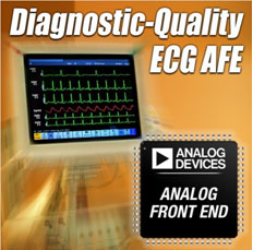 ADAS1000可有效用于各種ECG系統,包括診斷心電圖儀、床邊病人監護系統、動態監護儀和心臟除顫器。并為高導聯系統提供無縫擴展能力,只需極少的外部器件,并提供多個數字輸出接口選項。ADAS1000 AFE還支持基于AAMI(美國醫療儀器促進協會)和IEC(國際電工委員會)規范的設計。
