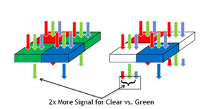 Clarity+方案開始于產業中常用的標準2x2拜耳(Bayer)RGB色彩濾波方法,之后將所有的綠色濾光片用精心優化的透明濾光片(clear filters)代替。這種模式保留了拜耳圖案的高頻空間信息,同時去除了較大內核(kernel)(4x4)模式下使用綠色和清晰透過濾光片所帶來的圖像變形偽影。而綠色則是通過先進的圖像處理算法來確定,包括使用減色(subtractive)和插值(interpolation)等技術。然后采用專門的降噪技術,這樣低光照下信噪比(SNR)可以得到3dB的改善,與RGB拜耳圖案可能的結果相當。