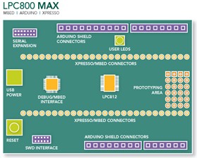 恩智浦與主要合作伙伴合作開發LPC800-MAX,這是一種與mbed、LPCXpresso和Arduino三種平臺都能銜接的開發板,允許用戶從每個環境中選擇合適的元件并進行使用。憑借LPC800系列微控制器引入的獨特的靈活開關矩陣功能,具有突破性的LPC800-MAX開發板互操作性得以實現,允許用戶配置幾乎任何引腳為各種可用功能。此外,憑借全新的mbed USB板載接口,用戶可選擇是想使用基于云的mbed工具進行開發,或是LPCXpresso IDE等離線工具鏈進行開發和調試。該開發板將于4月份上市。