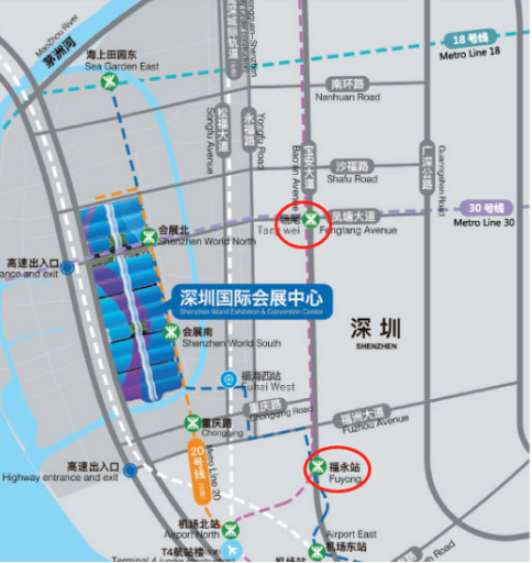 1、地鐵11號(hào)線塘尾站(D出口)<——>深圳國(guó)際會(huì)展中心