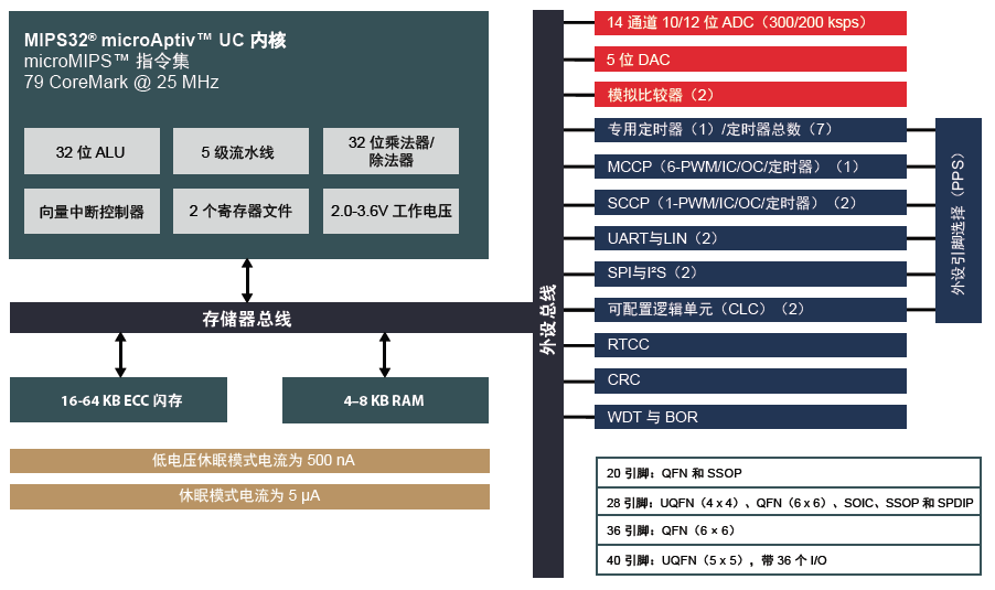 PIC32MM系列是Microchip功耗最低且最具成本效益的32位PIC32單片機系列。PIC32MM系列填補了我們廣受歡迎的 PIC24F XLP和 PIC32MX系列之間的空白。 PIC32MM器件的休眠模式電流低至 500 nA,封裝尺寸小至 4x4 mm,適用于需要更長電池壽命和更小外形的應用。該系列具有獨立于內核的外設, 例如可配置邏輯單元( CLC)和多輸出捕捉/比較/ PWM(MCCP),旨在降低 CPU負荷。PIC32MM系列采用緊湊型 microMIPS?指令、 microAptiv? UC 內核和影子寄存器集,在 25 MHz 時可達 79 CoreMark?評分。 microMIPS ISA整合了 16位和 32位指令,以實現緊湊的代碼。Microchip的 MPLAB®代碼配置器( MCC)支持 PIC32MM器件,有助于簡化設計。