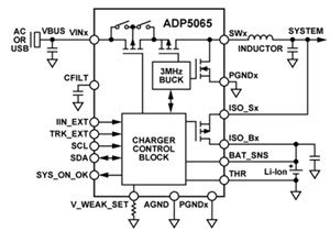 ADP5065充電器完全符合USB 2.0、USB 3.0和USB電池充電規(guī)格1.1,可通過mini-USB VBUS引腳從墻壁充電器、車載充電器或USB主機端口進行充電。其輸入電壓范圍為4 V至5.5 V,最高可耐受20 V電壓。這緩解了斷開或連接時的USB總線尖峰問題。ADP5065在DC-DC充電器輸出和電池間集成了內(nèi)部FET。這一設(shè)計可提供“電池隔離”,使系統(tǒng)可在“電池?zé)o電”或“無電池”情況下供電,從而直接通過USB電源執(zhí)行系統(tǒng)功能。根據(jù)外部USB檢測芯片檢測到的USB電源類型,ADP5065可設(shè)置為應(yīng)用正確的電流限值,實現(xiàn)最佳充電和USB合規(guī)性。ADP5065采用尺寸極小的薄型WLCSP-20(0.5 mm間距)封裝。