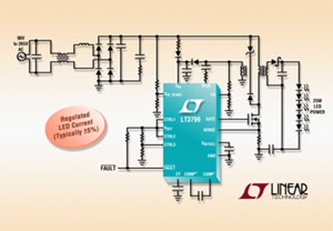 凌力爾特公司推出具備有源功率因數校正 (PFC) 的隔離型 LED 控制器 LT3799,該器件專為 90VAC 至 265VAC 的通用輸入范圍來驅動 LED 而設計。LT3799 專門針對那些需要 4W 至 100W+ LED 功率的 LED 應用而優化,并且與標準的 TRIAC 壁式調光器相兼容。LT3799 的獨特電流檢測方案可將一個經過良好調節的電流輸送至副端,而無需采用光耦合器。這不僅降低了成本,而且還改善了可靠性。該器件的單級 PFC 穩壓器設計所需的外部組件極少。此外,其耐熱增強型 MSOP-16E 封裝確保為離線式 LED 應用提供簡單和占板面積緊湊的解決方案。