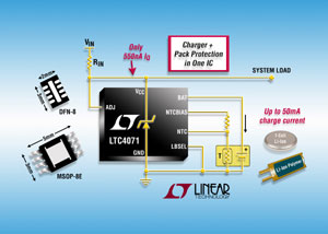 凌力爾特 (Linear) 推出面向鋰離子 / 聚合物電池的易用型纖巧并聯電池系統 LTC4071,該器件在一個 IC 中集成了充電器和電池組保護功能。由于其工作電流僅為 550nA,因此 LTC4071 可借助以往無法使用的非常低電流、間歇或連續充電電源來為電池提供充電及保護。LTC4071 能夠以高達 50mA 的電流進行電池充電。該器件擁有一種接近于零電流 (<0.1nA) 的低電池電量閉鎖斷接功能,甚至可避免低容量電池發生深度放電及遭受潛在無法修復的損壞。LTC4071 內置于扁平 (高度僅 0.75mm) 8 引腳 2mm x 3mm DFN 封裝之中,是目前市面上僅有的一款采用低功率級工作電源的完整和超緊湊型電池充電器和保護解決方案。該器件所擁有的諸多特點很適合于高阻抗和較低功率的充電電源應用,例如:能量提取 / 收集、阻性隔離或太陽能供電型系統。它能夠給鋰離子 / 鋰聚合物電池、鈕扣型電池和薄膜電池充電。