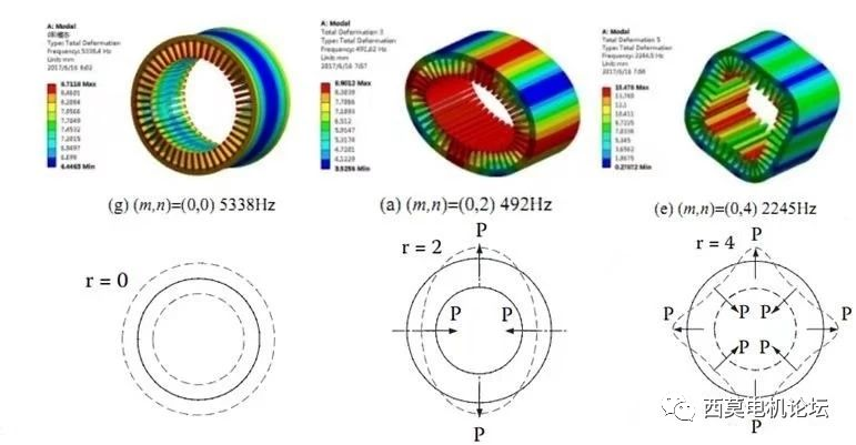 關于電機中各種諧波磁場形成的原因及產生的徑向力波特征的詳細推導見NVH那些事(四)~(六),有興趣深入了解相關內容的可參見那些文章,重點是要了解產生的徑向力波的三要素:階次(力型)、頻率和幅值大小,它們對電機的電磁振動將產生重大影響。