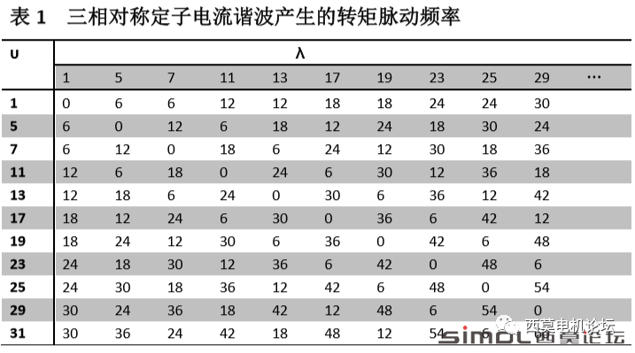 極對數相同但轉速或轉向不同的諧波磁場存在著相對轉差,因此它們相互作用會產生脈動的轉矩。轉矩脈動的頻率為基波電頻率的6的整數倍,轉子轉頻的6p整數倍。轉矩脈動的幅值與兩個同極對數諧波磁場的幅值乘積成正比。關于各次諧波磁場相互作用產生的脈動轉矩機理詳見 NVH那些事(三),為了方便查閱,現將那篇文章中歸納的定子電流各次時間諧波引起的各次磁場空間諧波相互作用產生的轉矩脈動頻率表重新貼出,表中的數據為轉矩脈動頻率與基波電流頻率之比。