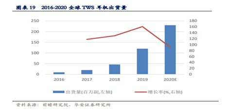 帶動NOR Flash市場增量的原因主要有以下三點,首先,TWS近幾年出貨量上升,2020E年TWS耳機出貨量接近250百萬副。