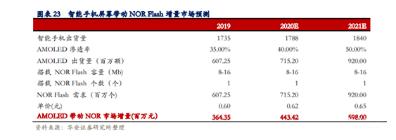 其次全球智能手機面板與OLED也是帶動增量 的重要原因, 2020E年智能手機出貨量達到1788百萬臺,此外,AMOLED出貨量達到715.2百萬顆,帶動NOR 市場增量443.42百萬元。
