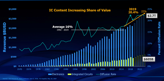 Wally Rhines博士總結到,電子設備和系統的半導體含量將繼續增長。經過20多年的發展,半導體含量相對穩定地保持在電子設備價值的16%,我們最近看到了這一含量比例的加速增長,現在大約占到電子設備價值的20%。