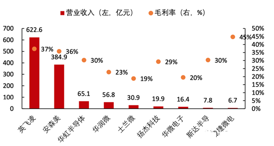 從收入體量來看,海外功率半導體領先廠商英飛凌和安森美 2019 年收入規模在大概 600 億和 400 億元人民幣,而國內收入規模領先的功率半導體代工廠華虹半導體和IDM廠商華潤微2019年收入規模在60億元上下,相較海外廠商具有較大差距。