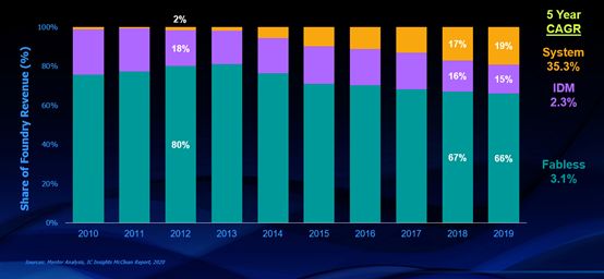 十年前,Fabless公司購買了晶圓制造廠商80%的晶圓,三星、英特爾和德州儀器等IDM購買了剩下的20%。如今,Google、蘋果和華為等系統和信息技術公司購買了接近20%的晶圓,這一細分市場每年都以35%的速度增長。