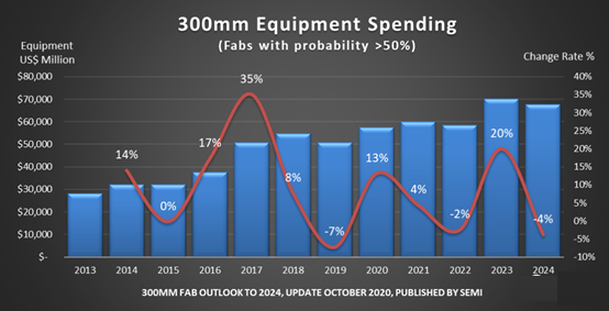 半導體Fab廠投資的增長將在2021年繼續,但增速將同比放緩4%。該報告還反映了之前的行業周期,并預測2022年將出現溫和放緩,在2023年創下700億美元的歷史新高后, 2024年將再次出現輕微下滑。見圖1。
