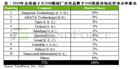 TrendForce集邦咨詢旗下半導體研究處調查2019年全球SSD模組廠自有品牌在渠道市場出貨排名,受惠于NAND Flash價格急速下滑,2019年全球SSD出貨量約有1億3100萬臺水平,較2018年成長近60%,普及度進一步提升,而金士頓(Kingston)、威剛(ADATA)與金泰克(Tigo)仍位居前三大模組廠品牌。